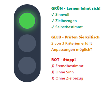 - Führen Sie eine „Lern-Ampel“ ein: Grün = selbstgewählt und sinnvoll, Rot = fremdbestimmt ohne Bezug.